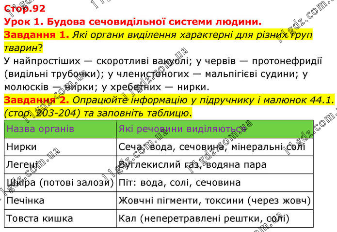 Стор.92 Урок 1. Будова сечовидільної системи людини. Завдання 1. Які органи виділення характерні для різних груп тварин? У найпростіших — скоротливі вакуолі; у червів — протонефридії (видільні трубочки); у членистоногих — мальпігієві судини; у молюсків — нирки; у хребетних — нирки. Завдання 2. Опрацюйте інформацію у підручнику і малюнок 44.1. (стор. 203-204) та заповніть таблицю. Назва органів Які речовини виділяються Нирки Сеча: вода, сечовина, мінеральні солі Легені Вуглекислий газ, водяна пара Шкіра (потові залози) Піт: вода, солі, сечовина Печінка Жовчні пігменти, токсини (через жовч) Товста кишка Кал (неперетравлені рештки, солі)