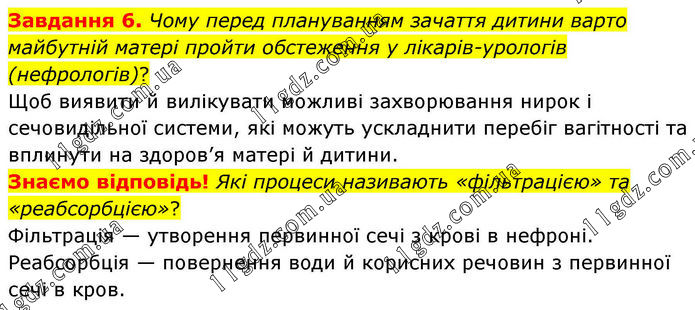 Завдання 6. Чому перед плануванням зачаття дитини варто майбутній матері пройти обстеження у лікарів-урологів (нефрологів)? Щоб виявити й вилікувати можливі захворювання нирок і сечовидільної системи, які можуть ускладнити перебіг вагітності та вплинути на здоров’я матері й дитини. Знаємо відповідь! Які процеси називають «фільтрацією» та «реабсорбцією»? Фільтрація — утворення первинної сечі з крові в нефроні. Реабсорбція — повернення води й корисних речовин з первинної сечі в кров.
