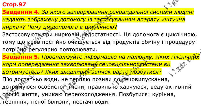 Стор.97 Завдання 4. За якого захворювання сечовидільної системи людині надають зображену допомогу із застосуванням апарату «штучна нирка»? Чому ця допомога є циклічною? Застосовують при нирковій недостатності. Ця допомога є циклічною, тому що кров постійно очищується від продуктів обміну і процедуру потрібно регулярно повторювати. Завдання 5. Проаналізуйте інформацію на малюнку. Яких гііієнічних норм попередження захворювань сечовидільної системи ви дотримуєтесь? Яких шкідливих звичок варто позбутися? П’ю достатньо води, не терплю позиви до сечовипускання, дотримуюся особистої гігієни, правильно харчуюся, веду активний спосіб життя, уникаю переохолодження. Позбутися: куріння, терпіння, тісної білизни, нестачі води.