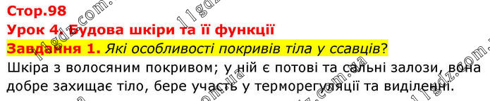 Стор.98 Урок 4. Будова шкіри та її функції Завдання 1. Які особливості покривів тіла у ссавців? Шкіра з волосяним покривом; у ній є потові та сальні залози, вона добре захищає тіло, бере участь у терморегуляції та виділенні.