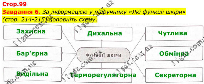 Завдання 6. За інформацією у підручнику «Які функції шкіри» (стор. 214-215) доповніть схему.
