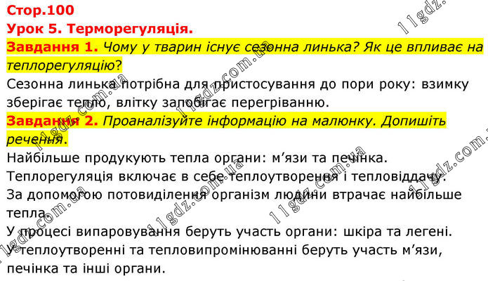 Стор.100 Урок 5. Терморегуляція. Завдання 1. Чому у тварин існує сезонна линька? Як це впливає на теплорегуляцію? Сезонна линька потрібна для пристосування до пори року: взимку зберігає тепло, влітку запобігає перегріванню. Завдання 2. Проаналізуйте інформацію на малюнку. Допишіть речення. Найбільше продукують тепла органи: м’язи та печінка. Теплорегуляція включає в себе теплоутворення і тепловіддачу. За допомогою потовиділення організм людини втрачає найбільше тепла. У процесі випаровування беруть участь органи: шкіра та легені. У теплоутворенні та тепловипромінюванні беруть участь м’язи, печінка та інші органи.