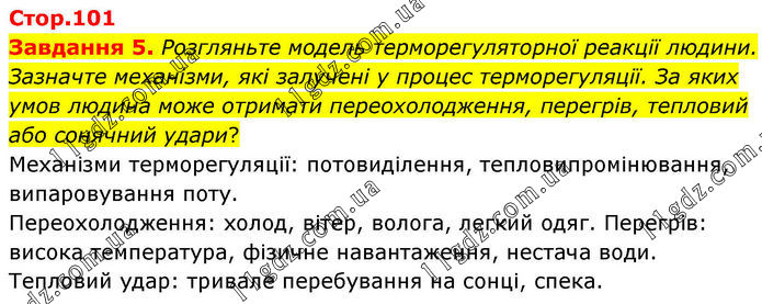 Стор.101 Завдання 5. Розгляньте модель терморегуляторної реакції людини. Зазначте механізми, які залучені у процес терморегуляції. За яких умов людина може отримати переохолодження, перегрів, тепловий або сонячний удари? Механізми терморегуляції: потовиділення, тепловипромінювання, випаровування поту. Переохолодження: холод, вітер, волога, легкий одяг. Перегрів: висока температура, фізичне навантаження, нестача води. Тепловий удар: тривале перебування на сонці, спека.