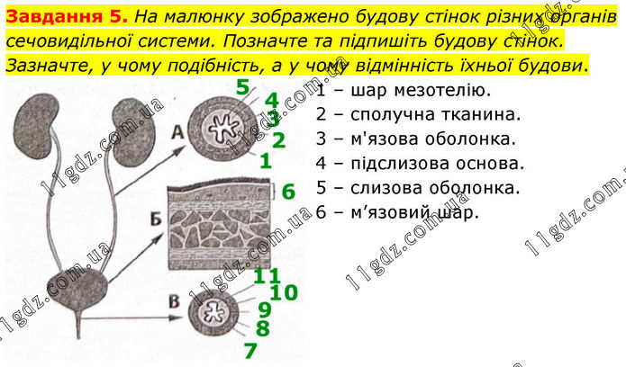 Завдання 5. На малюнку зображено будову стінок різних органів сечовидільної системи. Позначте та підпишіть будову стінок. Зазначте, у чому подібність, а у чому відмінність їхньої будови. 1 – шар мезотелію. 2 – сполучна тканина. 3 – м'язова оболонка. 4 – підслизова основа. 5 – слизова оболонка. 6 – м’язовий шар.
