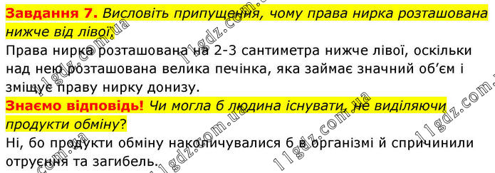 Завдання 7. Висловіть припущення, чому права нирка розташована нижче від лівої. Права нирка розташована на 2-3 сантиметра нижче лівої, оскільки над нею розташована велика печінка, яка займає значний об’єм і зміщує праву нирку донизу. Знаємо відповідь! Чи могла б людина існувати, не виділяючи продукти обміну? Ні, бо продукти обміну накопичувалися б в організмі й спричинили отруєння та загибель.