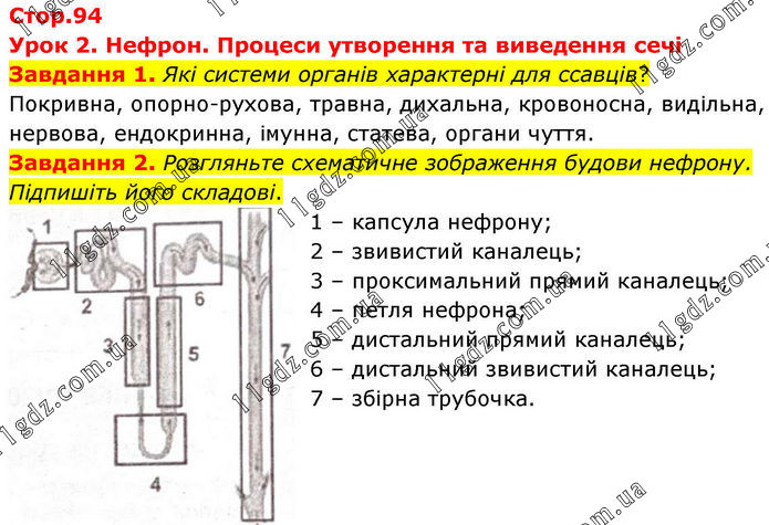 Стор.94 Урок 2. Нефрон. Процеси утворення та виведення сечі Завдання 1. Які системи органів характерні для ссавців? Покривна, опорно-рухова, травна, дихальна, кровоносна, видільна, нервова, ендокринна, імунна, статева, органи чуття. Завдання 2. Розгляньте схематичне зображення будови нефрону. Підпишіть його складові. 1 – капсула нефрону; 2 – звивистий каналець; 3 – проксимальний прямий каналець; 4 – петля нефрона; 5 – дистальний прямий каналець; 6 – дистальний звивистий каналець; 7 – збірна трубочка.