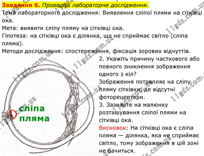 Завдання 6. Проведіть лабораторне дослідження. Тема лабораторного дослідження: Виявлення сліпої плями на сітківці ока. Мета: виявити сліпу пляму на сітківці ока. Гіпотеза: на сітківці ока є ділянка, що не сприймає світло (сліпа пляма). Методи дослідження: спостереження, фіксація зорових відчуттів. 2. Укажіть причину часткового або повного зникнення зображення одного з кіл? Зображення потрапляє на сліпу пляму сітківки, де відсутні фоторецептори. 3. Зазначте на малюнку розташування сліпої плями на сітківці ока. Висновок: На сітківці ока є сліпа пляма — ділянка, яка не сприймає світло, тому зображення в цій зоні не бачиться.