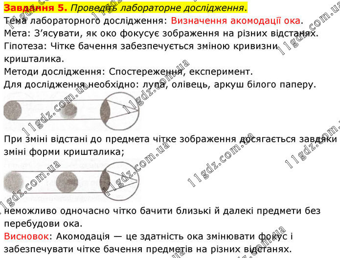 Завдання 5. Проведіть лабораторне дослідження. Тема лабораторного дослідження: Визначення акомодації ока. Мета: З’ясувати, як око фокусує зображення на різних відстанях. Гіпотеза: Чітке бачення забезпечується зміною кривизни кришталика. Методи дослідження: Спостереження, експеримент. Для дослідження необхідно: лупа, олівець, аркуш білого паперу. При зміні відстані до предмета чітке зображення досягається завдяки зміні форми кришталика; неможливо одночасно чітко бачити близькі й далекі предмети без перебудови ока. Висновок: Акомодація — це здатність ока змінювати фокус і забезпечувати чітке бачення предметів на різних відстанях.