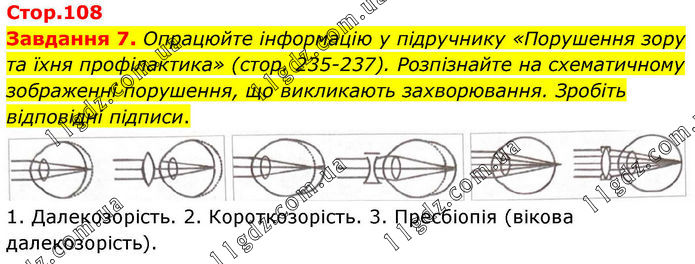 Стор.108 Завдання 7. Опрацюйте інформацію у підручнику «Порушення зору та їхня профілактика» (стор. 235-237). Розпізнайте на схематичному зображенні порушення, що викликають захворювання. Зробіть відповідні підписи. 1. Далекозорість. 2. Короткозорість. 3. Пресбіопія (вікова далекозорість).