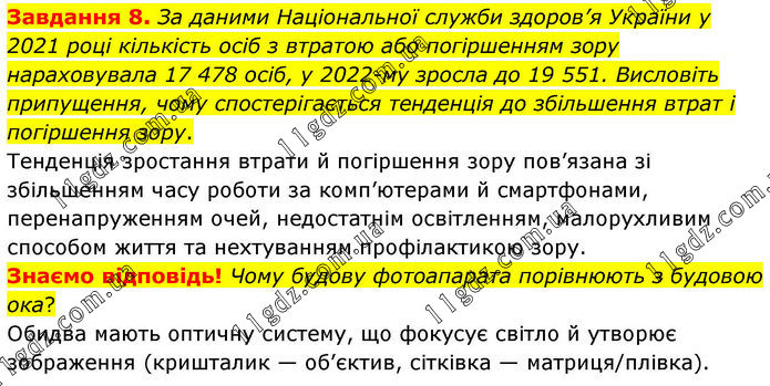Завдання 8. За даними Національної служби здоров’я України у 2021 році кількість осіб з втратою або погіршенням зору нараховувала 17 478 осіб, у 2022-му зросла до 19 551. Висловіть припущення, чому спостерігається тенденція до збільшення втрат і погіршення зору. Тенденція зростання втрати й погіршення зору пов’язана зі збільшенням часу роботи за комп’ютерами й смартфонами, перенапруженням очей, недостатнім освітленням, малорухливим способом життя та нехтуванням профілактикою зору. Знаємо відповідь! Чому будову фотоапарата порівнюють з будовою ока? Обидва мають оптичну систему, що фокусує світло й утворює зображення (кришталик — об’єктив, сітківка — матриця/плівка).