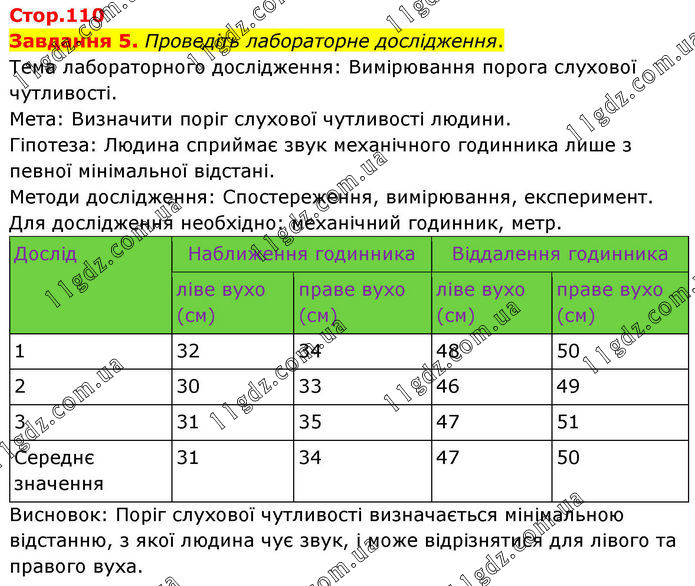 Стор.110 Завдання 5. Проведіть лабораторне дослідження. Тема лабораторного дослідження: Вимірювання порога слухової чутливості. Мета: Визначити поріг слухової чутливості людини. Гіпотеза: Людина сприймає звук механічного годинника лише з певної мінімальної відстані. Методи дослідження: Спостереження, вимірювання, експеримент. Для дослідження необхідно: механічний годинник, метр. Дослід Наближення годинника Віддалення годинника ліве вухо (см) праве вухо (см) ліве вухо (см) праве вухо (см) 1 32 34 48 50 2 30 33 46 49 3 31 35 47 51 Середнє значення 31 34 47 50 Висновок: Поріг слухової чутливості визначається мінімальною відстанню, з якої людина чує звук, і може відрізнятися для лівого та правого вуха.