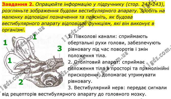 Завдання 2. Опрацюйте інформацію у підручнику (стор. 242-243), розгляньте зображення будови вестибулярного апарату. Зробіть на малюнку відповідні позначення та поясніть, як будова вестибулярного апарату відповідає функціям, які він виконує в організмі. 1. Півколові канали: сприймають обертальні рухи голови, забезпечують рівновагу під час поворотів і змін положення тіла. 2. Отолітовий апарат: сприймає положення тіла в просторі та прямолінійні прискорення, допомагає утримувати рівновагу. 3. Вестибулярний нерв: передає сигнали від рецепторів вестибулярного апарату до головного мозку.