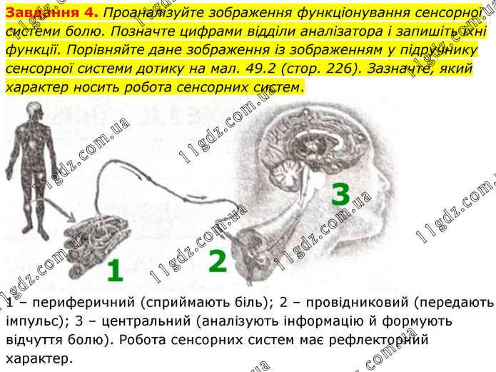 Завдання 4. Проаналізуйте зображення функціонування сенсорної системи болю. Позначте цифрами відділи аналізатора і запишіть їхні функції. Порівняйте дане зображення із зображенням у підручнику сенсорної системи дотику на мал. 49.2 (стор. 226). Зазначте, який характер носить робота сенсорних систем. 1 – периферичний (сприймають біль); 2 – провідниковий (передають імпульс); 3 – центральний (аналізують інформацію й формують відчуття болю). Робота сенсорних систем має рефлекторний характер.
