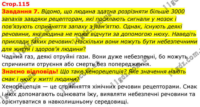 Стор.115 Завдання 7. Відомо, що людина здатна розрізняти більше 3000 запахів завдяки рецепторам, які посилають сигнали у мозок і пов’язують сприйняття запаху з пам’яттю. Однак, існують деякі речовини, які людина не може відчути за допомогою нюху. Наведіть приклади таких речовин. Наскільки вони можуть бути небезпечними для життя і здоров’я людини? Чадний газ, деякі отруйні гази. Вони дуже небезпечні, бо можуть спричинити отруєння або смерть без попередження. Знаємо відповідь! Що таке хеморецепція? Яке значення мають смак і нюх у житті людини? Хеморецепція — це сприйняття хімічних речовин рецепторами. Смак і нюх допомагають оцінювати їжу, виявляти небезпечні речовини та орієнтуватися в навколишньому середовищі.