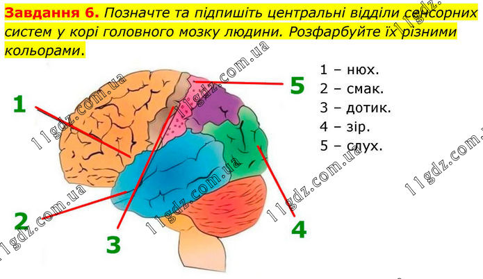 Завдання 6. Позначте та підпишіть центральні відділи сенсорних систем у корі головного мозку людини. Розфарбуйте їх різними кольорами. 1 – нюх. 2 – смак. 3 – дотик. 4 – зір. 5 – слух.