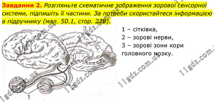 Завдання 2. Розгляньте схематичне зображення зорової сенсорної системи, підпишіть її частини. За потреби скористайтеся інформацією в підручнику (мал. 50.1, стор. 228). 1 – сітківка, 2 – зорові нерви, 3 – зорові зони кори головного мозку.