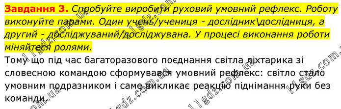 Завдання 3. Спробуйте виробити руховий умовний рефлекс. Роботу виконуйте парами. Один учень/учениця - дослідник\дослідниця, а другий - досліджуваний/досліджувана. У процесі виконання роботи міняйтеся ролями. Тому що під час багаторазового поєднання світла ліхтарика зі словесною командою сформувався умовний рефлекс: світло стало умовним подразником і саме викликає реакцію піднімання руки без команди.