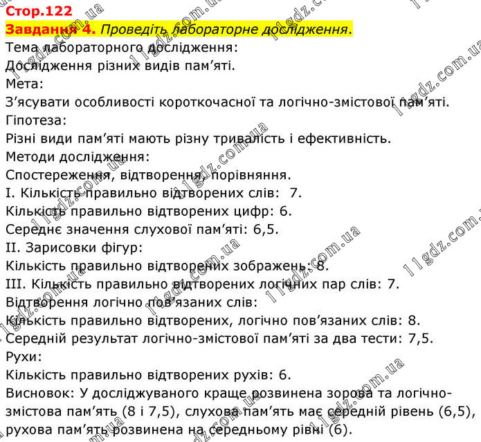 Стор.122 Завдання 4. Проведіть лабораторне дослідження. Тема лабораторного дослідження: Дослідження різних видів пам’яті. Мета: З’ясувати особливості короткочасної та логічно-змістової пам’яті. Гіпотеза: Різні види пам’яті мають різну тривалість і ефективність. Методи дослідження: Спостереження, відтворення, порівняння. I. Кількість правильно відтворених слів: 7. Кількість правильно відтворених цифр: 6. Середнє значення слухової пам’яті: 6,5. II. Зарисовки фігур: Кількість правильно відтворених зображень: 8. III. Кількість правильно відтворених логічних пар слів: 7. Відтворення логічно пов’язаних слів: Кількість правильно відтворених, логічно пов’язаних слів: 8. Середній результат логічно-змістової пам’яті за два тести: 7,5. Рухи: Кількість правильно відтворених рухів: 6. Висновок: У досліджуваного краще розвинена зорова та логічно-змістова пам’ять (8 і 7,5), слухова пам’ять має середній рівень (6,5), рухова пам’ять розвинена на середньому рівні (6).