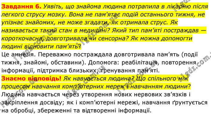 Завдання 6. Уявіть, що знайома людина потрапила в лікарню після легкого струсу мозку. Вона не пам'ятає подій останнього тижня, не упізнає знайомих, не може згадати, як отримала струс. Як називається такий стан в медицині? Який тип пам’яті постраждав — короткочасна, довготривала чи сенсорна? Як можна допомогти людині відновити пам’ять? Це амнезія. Переважно постраждала довготривала пам’ять (події тижня, знайомі, обставини). Допомога: реабілітація, повторення інформації, підтримка близьких, тренування пам’яті. Знаємо відповідь! Як навчається людина? Що спільного між процесом навчання комп’ютерних мереж і навчанням людини? Людина навчається через утворення нових нервових зв’язків і закріплення досвіду; як і комп’ютерні мережі, навчання ґрунтується на обробці, збереженні та відтворенні інформації.