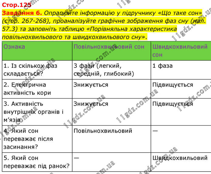 Стор.125 Завдання 6. Опрацюйте інформацію у підручнику «Що таке сон» (стор. 267-268), проаналізуйте графічне зображення фаз сну (мал. 57.3) та заповніть таблицю «Порівняльна характеристика повільнохвильового та швидкохвильового сну». Ознака Повільнохвильовий сон Швидкохвильовий сон 1. Із скількох фаз складається? 3 фази (легкий, середній, глибокий) 1 фаза 2. Електрична активність кори Знижується Підвищується 3. Активність внутрішніх органів і м’язів Знижується Підвищується 4. Який сон переважає після засинання? Повільнохвильовий — 5. Який сон переважає під ранок? — Швидкохвильовий
