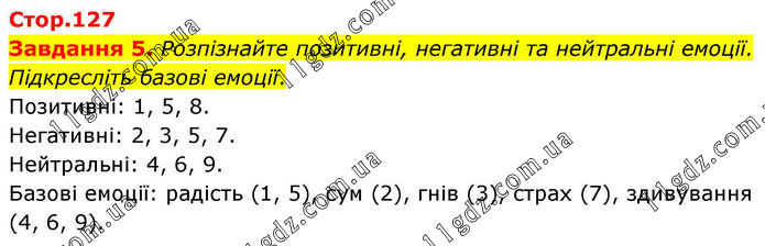 Стор.127 Завдання 5. Розпізнайте позитивні, негативні та нейтральні емоції. Підкресліть базові емоції. Позитивні: 1, 5, 8. Негативні: 2, 3, 5, 7. Нейтральні: 4, 6, 9. Базові емоції: радість (1, 5), сум (2), гнів (3), страх (7), здивування (4, 6, 9).