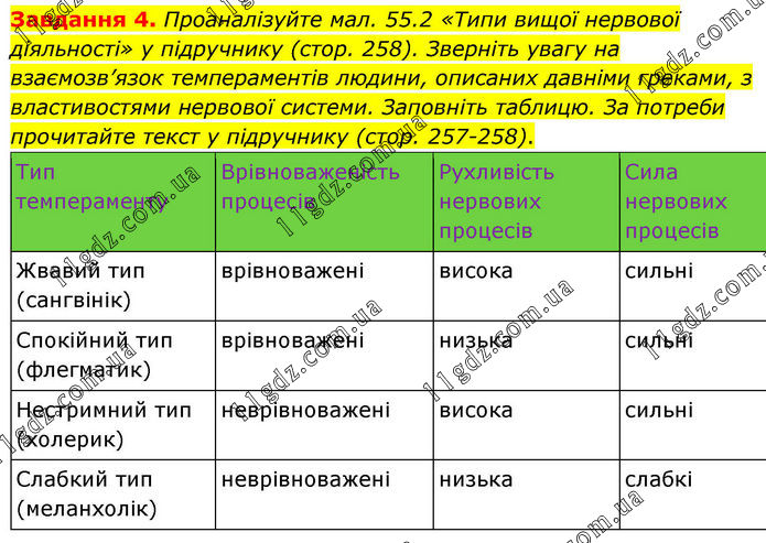 Завдання 4. Проаналізуйте мал. 55.2 «Типи вищої нервової діяльності» у підручнику (стор. 258). Зверніть увагу на взаємозв’язок темпераментів людини, описаних давніми греками, з властивостями нервової системи. Заповніть таблицю. За потреби прочитайте текст у підручнику (стор. 257-258). Тип темпераменту Врівноваженість процесів Рухливість нервових процесів Сила нервових процесів Жвавий тип (сангвінік) врівноважені висока сильні Спокійний тип (флегматик) врівноважені низька сильні Нестримний тип (холерик) неврівноважені висока сильні Слабкий тип (меланхолік) неврівноважені низька слабкі