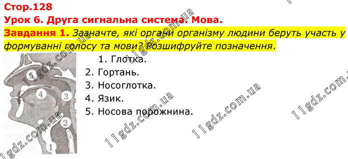 Стор.128 Урок 6. Друга сигнальна система. Мова. Завдання 1. Зазначте, які органи організму людини беруть участь у формуванні голосу та мови? Розшифруйте позначення. 1. Глотка. 2. Гортань. 3. Носоглотка. 4. Язик. 5. Носова порожнина.