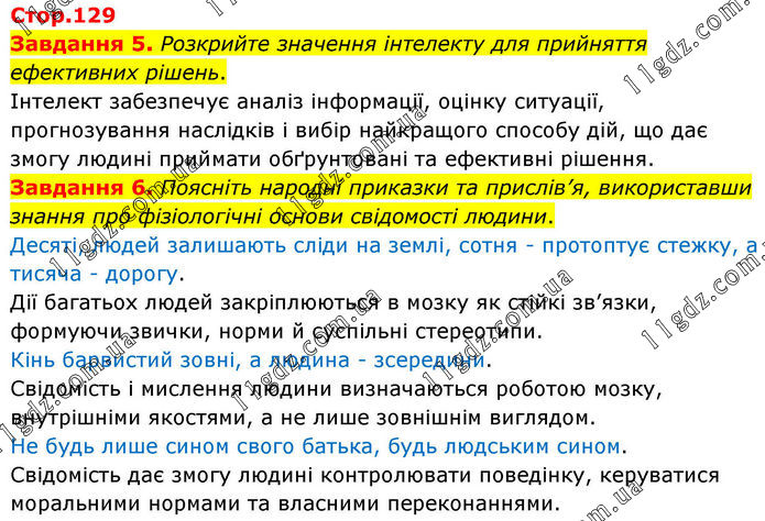 Стор.129 Завдання 5. Розкрийте значення інтелекту для прийняття ефективних рішень. Інтелект забезпечує аналіз інформації, оцінку ситуації, прогнозування наслідків і вибір найкращого способу дій, що дає змогу людині приймати обґрунтовані та ефективні рішення. Завдання 6. Поясніть народні приказки та прислів’я, використавши знання про фізіологічні основи свідомості людини. Десяті, людей залишають сліди на землі, сотня - протоптує стежку, а тисяча - дорогу. Дії багатьох людей закріплюються в мозку як стійкі зв’язки, формуючи звички, норми й суспільні стереотипи. Кінь барвистий зовні, а людина - зсередини. Свідомість і мислення людини визначаються роботою мозку, внутрішніми якостями, а не лише зовнішнім виглядом. He будь лише сином свого батька, будь людським сином. Свідомість дає змогу людині контролювати поведінку, керуватися моральними нормами та власними переконаннями.