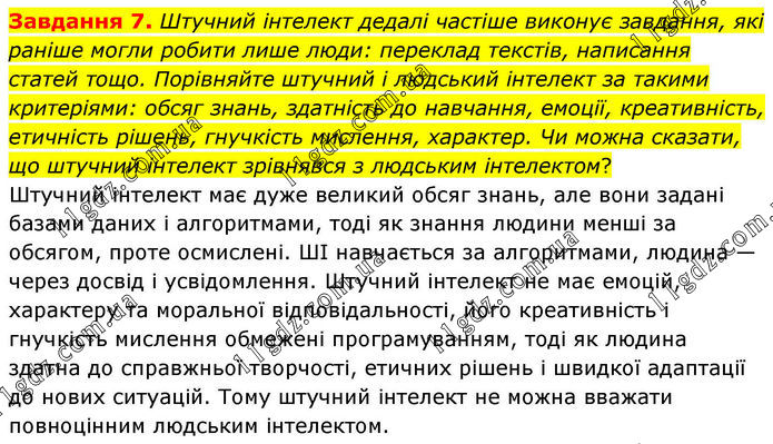 Завдання 7. Штучний інтелект дедалі частіше виконує завдання, які раніше могли робити лише люди: переклад текстів, написання статей тощо. Порівняйте штучний і людський інтелект за такими критеріями: обсяг знань, здатність до навчання, емоції, креативність, етичність рішень, гнучкість мислення, характер. Чи можна сказати, що штучний інтелект зрівнявся з людським інтелектом? Штучний інтелект має дуже великий обсяг знань, але вони задані базами даних і алгоритмами, тоді як знання людини менші за обсягом, проте осмислені. ШІ навчається за алгоритмами, людина — через досвід і усвідомлення. Штучний інтелект не має емоцій, характеру та моральної відповідальності, його креативність і гнучкість мислення обмежені програмуванням, тоді як людина здатна до справжньої творчості, етичних рішень і швидкої адаптації до нових ситуацій. Тому штучний інтелект не можна вважати повноцінним людським інтелектом.