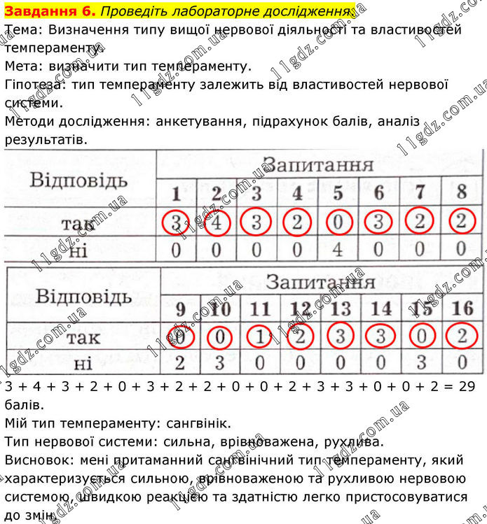 Завдання 6. Проведіть лабораторне дослідження. Тема: Визначення типу вищої нервової діяльності та властивостей темпераменту. Мета: визначити тип темпераменту. Гіпотеза: тип темпераменту залежить від властивостей нервової системи. Методи дослідження: анкетування, підрахунок балів, аналіз результатів. 3 + 4 + 3 + 2 + 0 + 3 + 2 + 2 + 0 + 0 + 2 + 3 + 3 + 0 + 0 + 2 = 29 балів. Мій тип темпераменту: сангвінік. Тип нервової системи: сильна, врівноважена, рухлива. Висновок: мені притаманний сангвінічний тип темпераменту, який характеризується сильною, врівноваженою та рухливою нервовою системою, швидкою реакцією та здатністю легко пристосовуватися до змін.