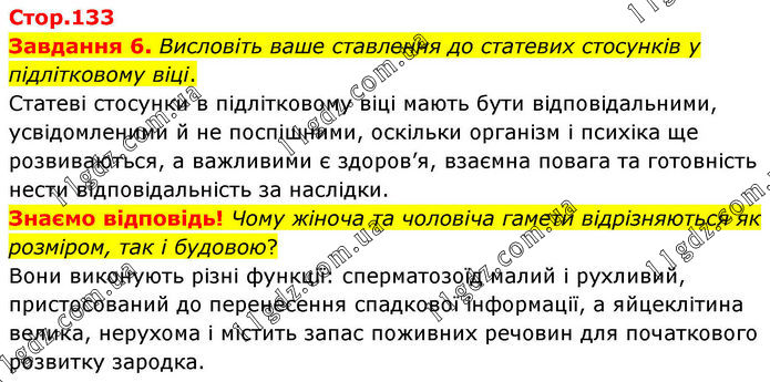 Стор.133 Завдання 6. Висловіть ваше ставлення до статевих стосунків у підлітковому віці. Статеві стосунки в підлітковому віці мають бути відповідальними, усвідомленими й не поспішними, оскільки організм і психіка ще розвиваються, а важливими є здоров’я, взаємна повага та готовність нести відповідальність за наслідки. Знаємо відповідь! Чому жіноча та чоловіча гамети відрізняються як розміром, так і будовою? Вони виконують різні функції: сперматозоїд малий і рухливий, пристосований до перенесення спадкової інформації, а яйцеклітина велика, нерухома і містить запас поживних речовин для початкового розвитку зародка.