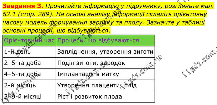 Завдання 3. Прочитайте інформацію у підручнику, розгляньте мал. 62.1 (стор. 289). На основі аналізу інформації складіть орієнтовну часову модель формування зародку та плоду. Зазначте у таблиці основні процеси, що відбуваються. Орієнтовний час Процеси, що відбуваються 1-й день Запліднення, утворення зиготи 2–5-та доба Поділ зиготи, зародок 4–5-та доба Імплантація в матку 2-й місяць Утворення плаценти, плід 3–9-й місяці Ріст і розвиток плода