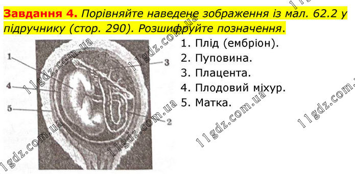 Завдання 4. Порівняйте наведене зображення із мал. 62.2 у підручнику (стор. 290). Розшифруйте позначення. 1. Плід (ембріон). 2. Пуповина. 3. Плацента. 4. Плодовий міхур. 5. Матка.