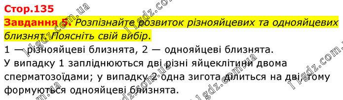 Стор.135 Завдання 5. Розпізнайте розвиток різнояйцевих та однояйцевих близнят. Поясніть свій вибір. 1 — різнояйцеві близнята, 2 — однояйцеві близнята. У випадку 1 запліднюються дві різні яйцеклітини двома сперматозоїдами; у випадку 2 одна зигота ділиться на дві, тому формуються однояйцеві близнята.