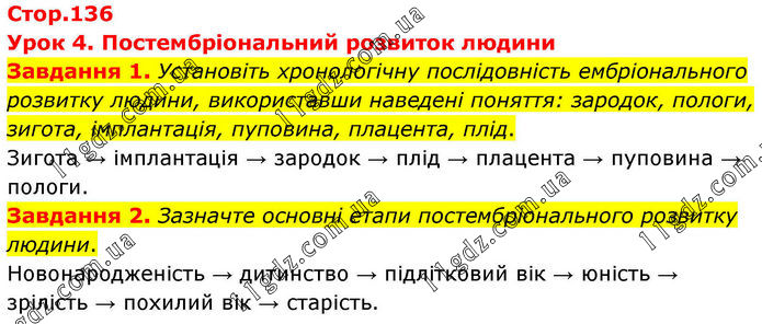 Стор.136 Урок 4. Постембріональний розвиток людини Завдання 1. Установіть хронологічну послідовність ембріонального розвитку людини, використавши наведені поняття: зародок, пологи, зигота, імплантація, пуповина, плацента, плід. Зигота → імплантація → зародок → плід → плацента → пуповина → пологи. Завдання 2. Зазначте основні етапи постембріонального розвитку людини. Новонародженість → дитинство → підлітковий вік → юність → зрілість → похилий вік → старість.