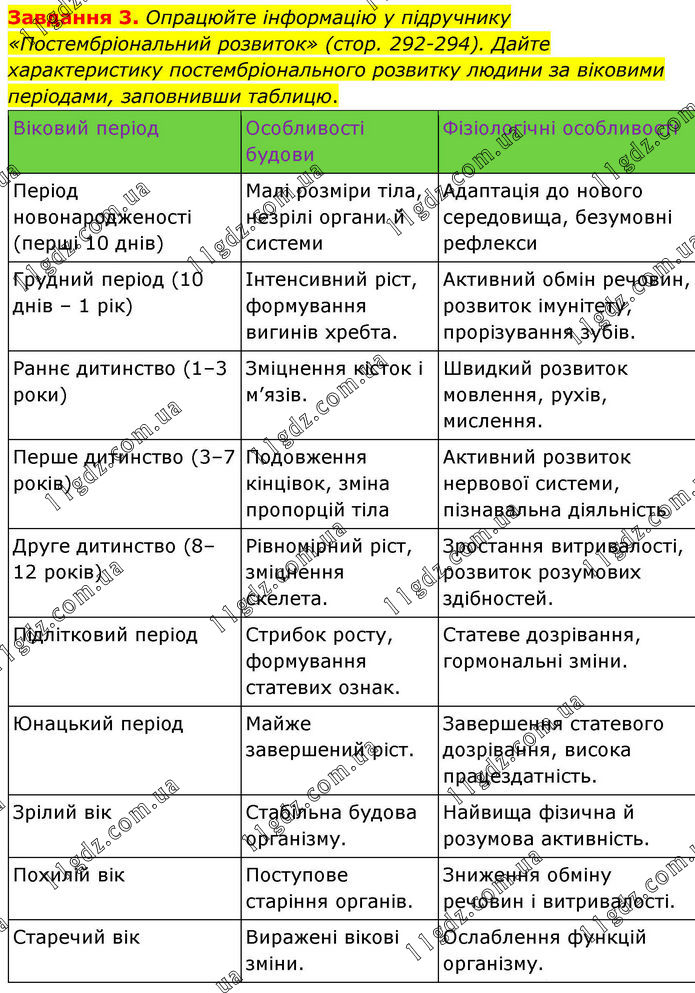 Завдання 3. Опрацюйте інформацію у підручнику «Постембріональний розвиток» (стор. 292-294). Дайте характеристику постембріонального розвитку людини за віковими періодами, заповнивши таблицю. Віковий період Особливості будови Фізіологічні особливості Період новонародженості (перші 10 днів) Малі розміри тіла, незрілі органи й системи Адаптація до нового середовища, безумовні рефлекси Грудний період (10 днів – 1 рік) Інтенсивний ріст, формування вигинів хребта. Активний обмін речовин, розвиток імунітету, прорізування зубів. Раннє дитинство (1–3 роки) Зміцнення кісток і м’язів. Швидкий розвиток мовлення, рухів, мислення. Перше дитинство (3–7 років) Подовження кінцівок, зміна пропорцій тіла Активний розвиток нервової системи, пізнавальна діяльність Друге дитинство (8–12 років) Рівномірний ріст, зміцнення скелета. Зростання витривалості, розвиток розумових здібностей. Підлітковий період Стрибок росту, формування статевих ознак. Статеве дозрівання, гормональні зміни. Юнацький період Майже завершений ріст. Завершення статевого дозрівання, висока працездатність. Зрілий вік Стабільна будова організму. Найвища фізична й розумова активність. Похилій вік Поступове старіння органів. Зниження обміну речовин і витривалості. Старечий вік Виражені вікові зміни. Ослаблення функцій організму.