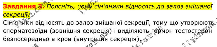 Завдання 3. Поясніть, чому сім’яники відносять до залоз змішаної секреції. Сім’яники відносять до залоз змішаної секреції, тому що утворюють сперматозоїди (зовнішня секреція) і виділяють гормон тестостерон безпосередньо в кров (внутрішня секреція).