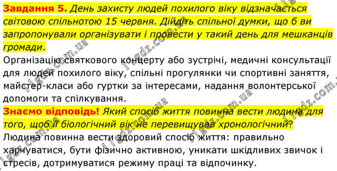 Завдання 5. День захисту людей похилого віку відзначається світовою спільнотою 15 червня. Дійдіть спільної думки, що б ви запропонували організувати і провести у такий день для мешканців громади. Організацію святкового концерту або зустрічі, медичні консультації для людей похилого віку, спільні прогулянки чи спортивні заняття, майстер-класи або гуртки за інтересами, надання волонтерської допомоги та спілкування. Знаємо відповідь! Який спосіб життя повинна вести людина для того, щоб її біологічний вік не перевищував хронологічний? Людина повинна вести здоровий спосіб життя: правильно харчуватися, бути фізично активною, уникати шкідливих звичок і стресів, дотримуватися режиму праці та відпочинку.
