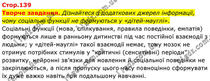 Стор.139 Творче завдання. Дізнайтеся з додаткових джерел інформації, чому соціальні функції не формуються у «дітей-мауглі». Соціальні функції (мова, спілкування, правила поведінки, емпатія) формуються лише в ранньому дитинстві під час постійної взаємодії з людьми; у «дітей-мауглі» такої взаємодії немає, тому мозок не отримує потрібних стимулів у “критичні (сенситивні) періоди” розвитку, нейронні зв’язки для мовлення й соціальної поведінки не закріплюються, а після пропуску цього часу повноцінно сформувати їх дуже важко навіть при подальшому навчанні.