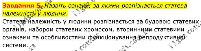 Завдання 5. Назвіть ознаки, за якими розпізнається статева належність у людини. Статева належність у людини розпізнається за будовою статевих органів, набором статевих хромосом, вторинними статевими ознаками та особливостями функціонування репродуктивної системи.