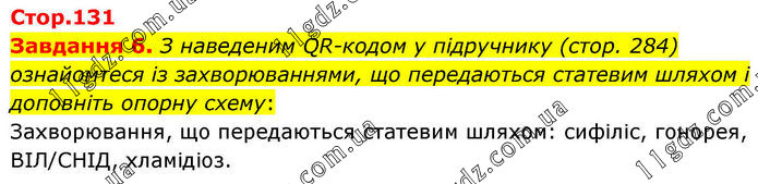 Стор.131 Завдання 6. З наведеним QR-кодом у підручнику (стор. 284) ознайомтеся із захворюваннями, що передаються статевим шляхом і доповніть опорну схему: Захворювання, що передаються статевим шляхом: сифіліс, гонорея, ВІЛ/СНІД, хламідіоз.