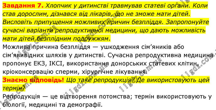 Завдання 7. Хлопчик у дитинстві травмував статеві органи. Коли став дорослим, дізнався від лікарів, що не зможе мати дітей. Висловіть припущення можливих причин безпліддя. Запропонуйте сучасні варіанти репродуктивної медицини, що дають можливість мати дітей безплідним подружжям. Можлива причина безпліддя — ушкодження сім’яників або сім’явивідних шляхів у дитинстві. Сучасна репродуктивна медицина пропонує ЕКЗ, ІКСІ, використання донорських статевих клітин, кріоконсервацію сперми, хірургічне лікування. Знаємо відповідь! Що таке репродукція? Де використовують цей термін? Репродукція — це відтворення потомства; термін використовують у біології, медицині та демографії.