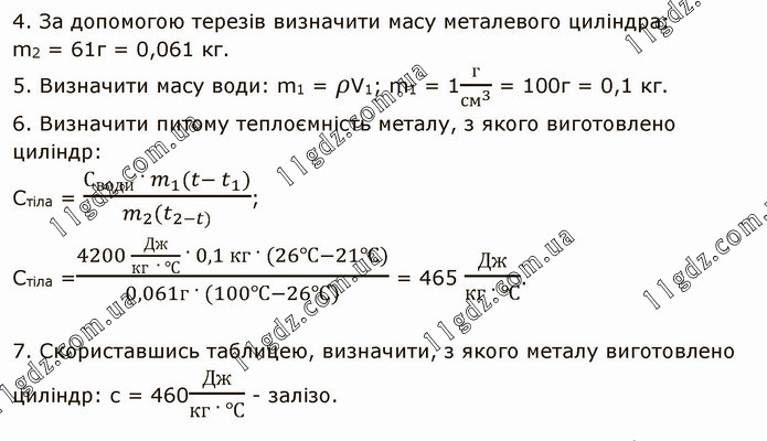 4. За допомогою терезів визначити масу металевого циліндра: m2 = 61г = 0,061 кг. 5. Визначити масу води: m1 = ρV1; m1 = 1г/〖см〗^3 = 100г = 0,1 кг. 6. Визначити питому теплоємність металу, з якого виготовлено циліндр: Стіла = (С_води · m_1 (t- t_1))/(m_2 (t_(2-t)) ); Стіла =(4200 Дж/(кг · ℃) · 0,1 кг · (26℃-21℃))/(0,061г · (100℃-26℃)) = 465 Дж/(кг · ℃). 7. Скориставшись таблицею, визначи¬ти, з якого металу виготовлено циліндр: с = 460Дж/(кг · ℃) - залізо.