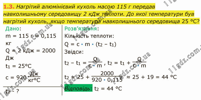 Нагрітий алюмінієвий кухоль масою 115 г передав навколишньому середовищу 2 кДж теплоти. До якої температури був нагрітий кухоль, якщо температура навколишнього середовища 25 °С?