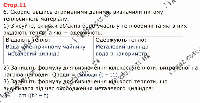 6. Скориставшись отриманими даними, визначили питому теплоємність матеріалу. 1) З’ясуйте, скільки об’єктів бере участь у теплообміні та які з них віддають тепло, а які — одержують. Віддають тепло: Вода електричному чайнику металевий циліндр Одержують тепло: Металевий циліндр вода в калориметрі 2) Запишіть формулу для визначення кількості теплоти, витраченої на нагрівання води: Qводи = cmводи (t – t1) 3) Запишіть формулу для визначення кількості теплоти, що виділилася під час охолодження металевого циліндра: Qц = сmц(t2 – t)
