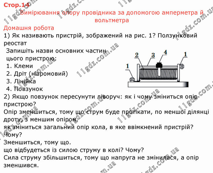Вимірювання опору провідника за допомогою амперметра й вольтметра Домашня робота 1) Як називають пристрій, зображений на рис. 1? Ползунковий реостат Запишіть назви основних частин цього пристрою: 1. Клеми 2. Дріт (нізромовий) 3. Лінійка 4. Повзунок 2) Якщо повзунок пересунути ліворуч: як і чому зміниться опір пристрою? Опір зменшиться, тому що струм буде протікати, по меншої ділянці дроту, з меншим опіром. як зміниться загальний опір кола, в яке ввімкнений пристрій? Чому? Зменшиться, тому що. що відбудеться із силою струму в колі? Чому? Сила струму збільшиться, тому що напруга не змінилася, а опір зменшився.