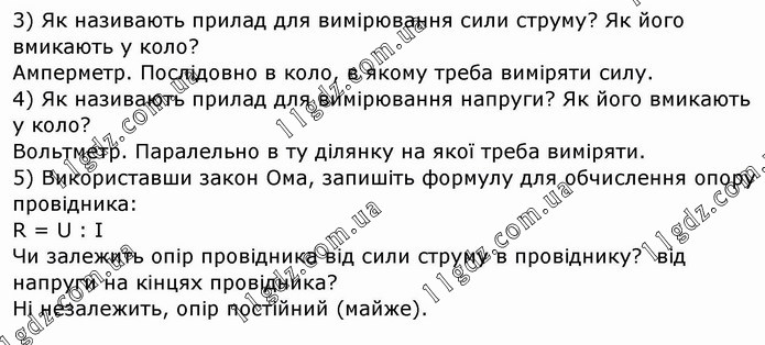 3) Як називають прилад для вимірювання сили струму? Як його вмикають у коло? Амперметр. Послідовно в коло, в якому треба виміряти силу. 4) Як називають прилад для вимірювання напруги? Як його вмикають у коло? Вольтметр. Паралельно в ту ділянку на якої треба виміряти. 5) Використавши закон Ома, запишіть формулу для обчислення опору провідника: R = U : I Чи залежить опір провідника від сили струму в провіднику? від напруги на кінцях провідника? Ні незалежить, опір постійний (майже).