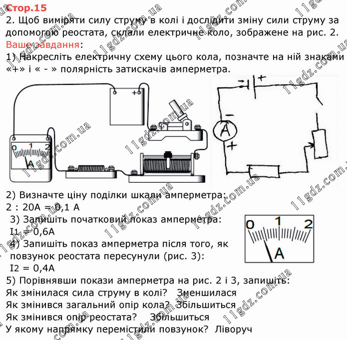2. Щоб виміряти силу струму в колі і дослідити зміну сили струму за допомогою реостата, склали електричне коло, зображене на рис. 2. Ваше завдання: 1) Накресліть електричну схему цього кола, позначте на ній знаками «+» і « - » полярність затискачів амперметра. 2) Визначте ціну поділки шкали амперметра: 2 : 20А = 0,1 А 3) Запишіть початковий показ амперметра: І1 = 0,6А 4) Запишіть показ амперметра після того, як повзунок реостата пересунули (рис. 3): І2 = 0,4А 5) Порівнявши покази амперметра на рис. 2 і 3, запишіть: Як змінилася сила струму в колі? Зменшилася Як змінився загальний опір кола? Збільшиться Як змінився опір реостата? Збільшиться У якому напрямку перемістили повзунок? Ліворуч