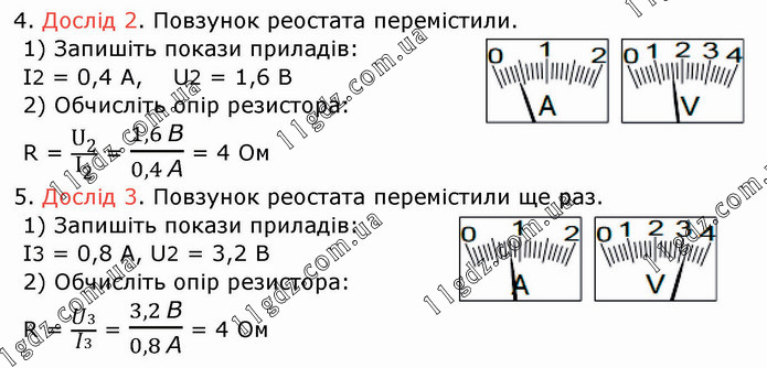 4. Дослід 2. Повзунок реостата перемістили. 1) Запишіть покази приладів: І2 = 0,4 А, U2 = 1,6 В 2) Обчисліть опір резистора: R = U_2/I_2 = (1,6 В)/(0,4 А) = 4 Ом 5. Дослід 3. Повзунок реостата перемістили ще раз. 1) Запишіть покази приладів: І3 = 0,8 А, U2 = 3,2 В 2) Обчисліть опір резистора: R = U3/I3 = (3,2 В)/(0,8 А) = 4 Ом