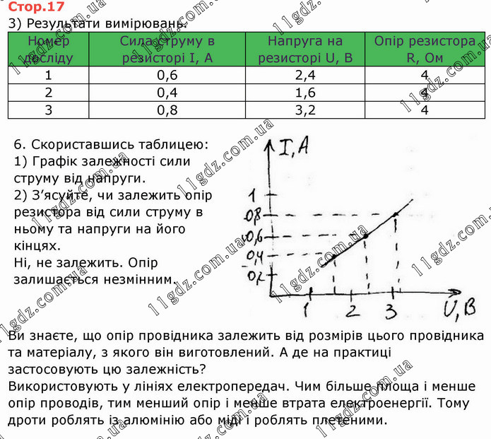 6. Скориставшись таблицею: 1) Графік залежності сили струму від напруги. 2) З’ясуйте, чи залежить опір резистора від сили струму в ньому та напруги на його кінцях. Ні, не залежить. Опір залишається незмінним. Ви знаєте, що опір провідника залежить від розмірів цього провідника та матеріалу, з якого він виготовлений. А де на практиці застосовують цю залежність? Використовують у лініях електропередач. Чим більше площа і менше опір проводів, тим менший опір і менше втрата електроенергії. Тому дроти роблять із алюмінію або міді і роблять плетеними.